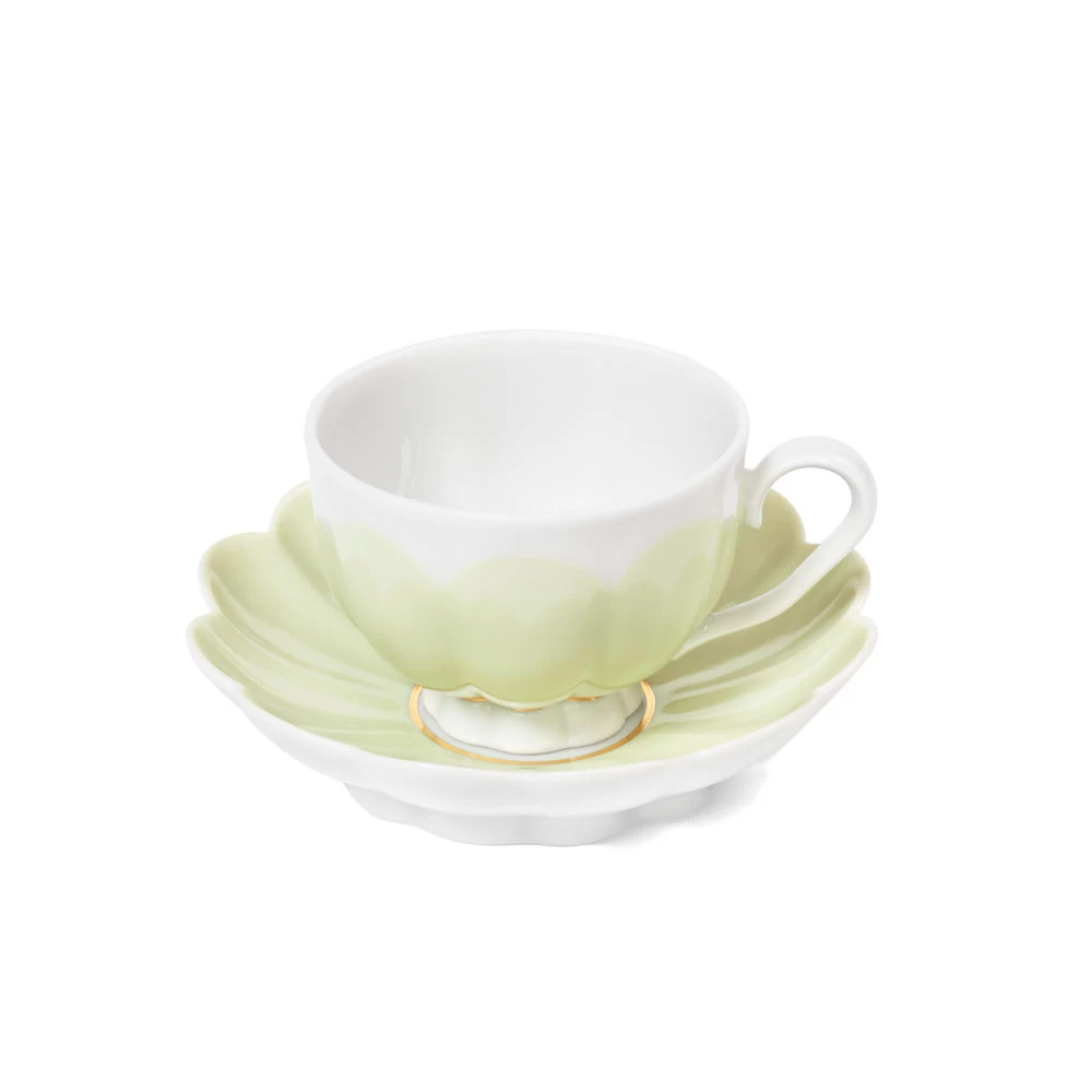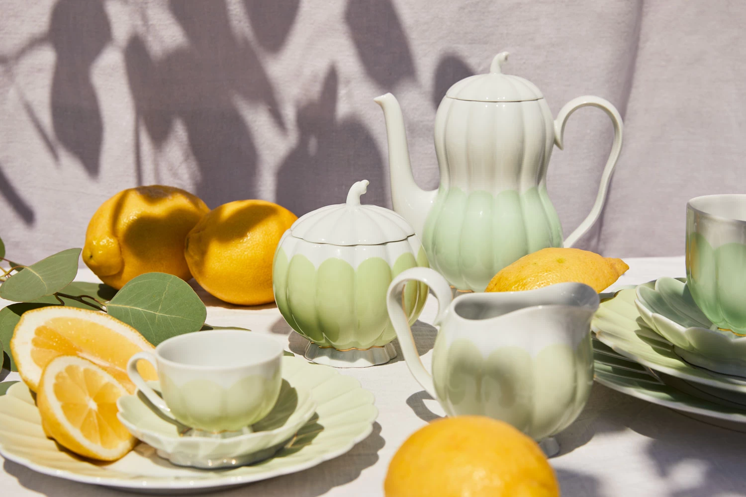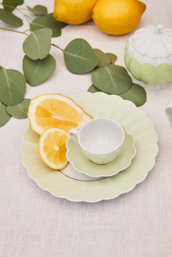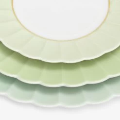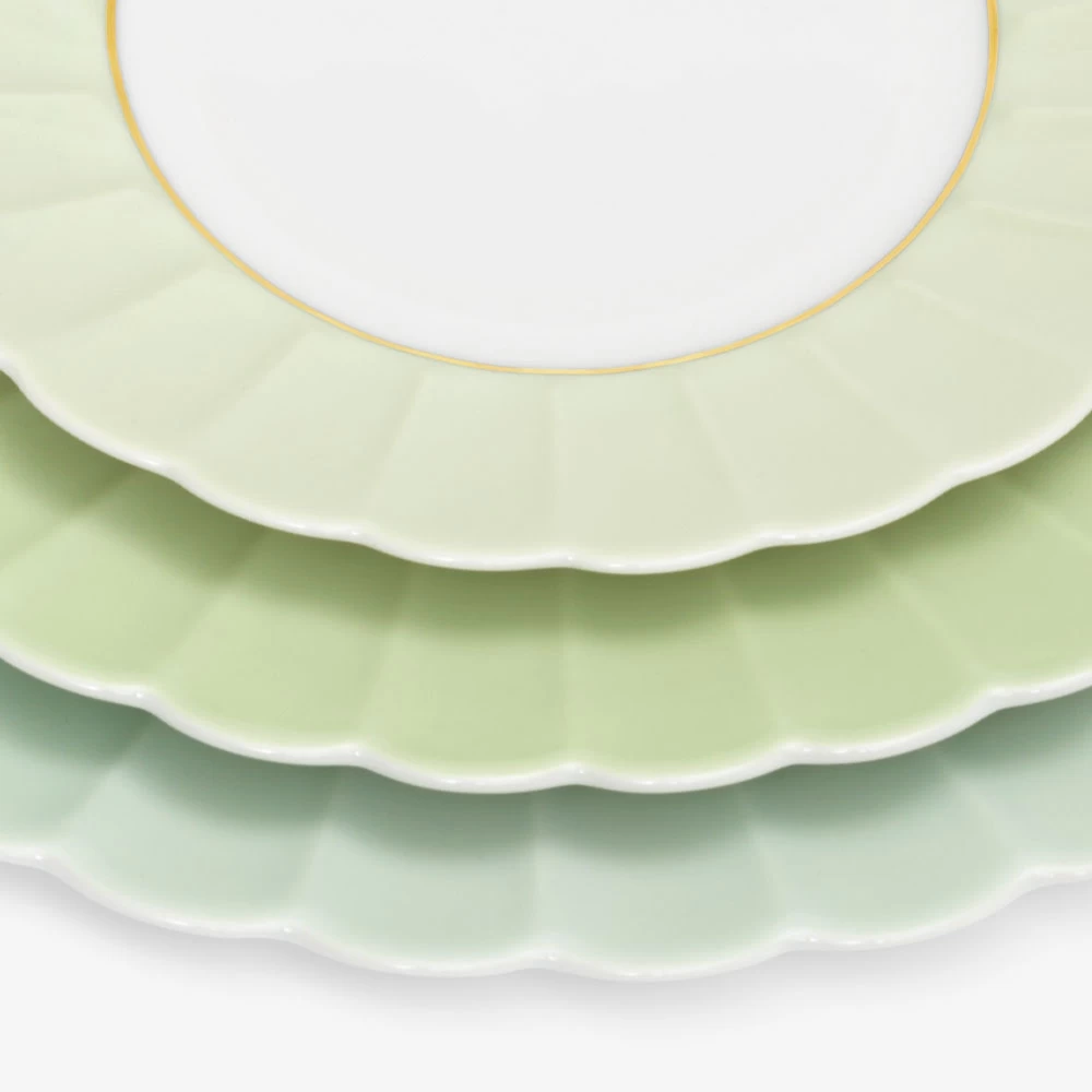 The Cairo Jaipur Dinnerware collection features a scalloped rim with various shades of celadon and adorned with a thin gold rim around the center edge. Designed in collaboration with Giambattista Valli and produced by Augarten.