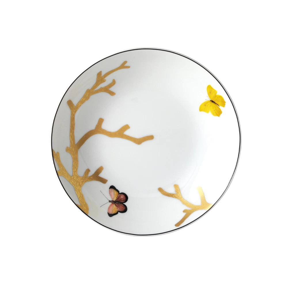 The Aux Oiseaux collection was inspired by the curiosity cabinets that were fashionable in the 16th and 17th centuries. Reminiscent of Japanese prints, colorful birds perch on stylized trees in raised gold.