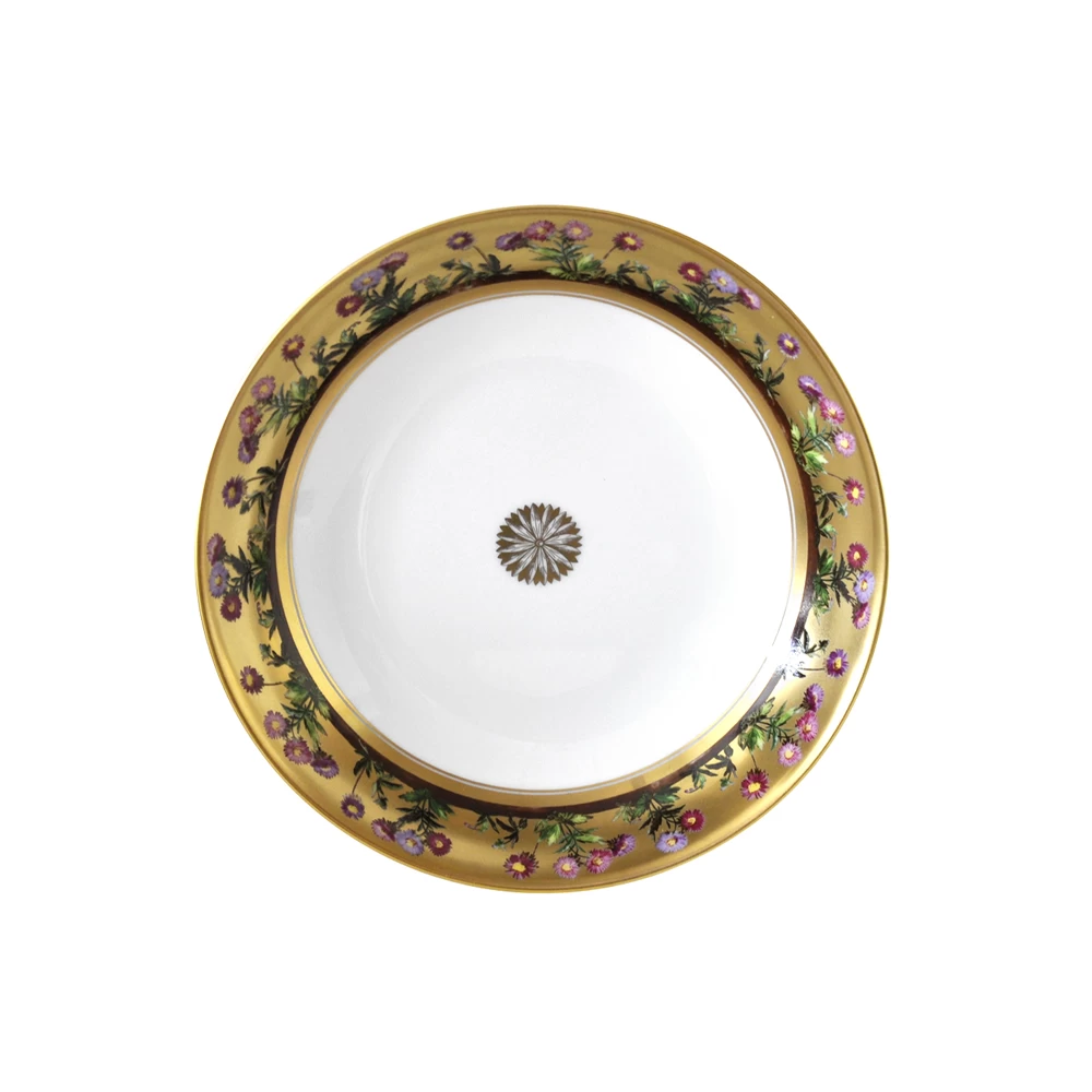 The Héloïse collection offers a floral look that is at once vibrant and timeless. Delicate, natural looking daisies sit upon a field of satiny gold. The collection references a type of French dinner service bearing accurate botanical representations that were popular in the 19th century.