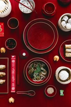 Rouge Empereur uses high fired glazes to create the ‘cracked’ texture that reveals hints of the white porcelain beneath. The deep red of the glaze is one of the most difficult colors to master in ceramics, making this collection an exceptional display of craftsmanship. Lined with a gold rim to add to its regal appearance.