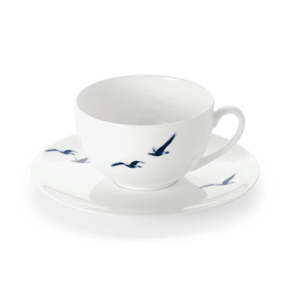 The Dibbern Blue Birds collection features fine bone china adorned by a blue flock of birds soaring through the sky. Dishwasher and Microwave Safe.