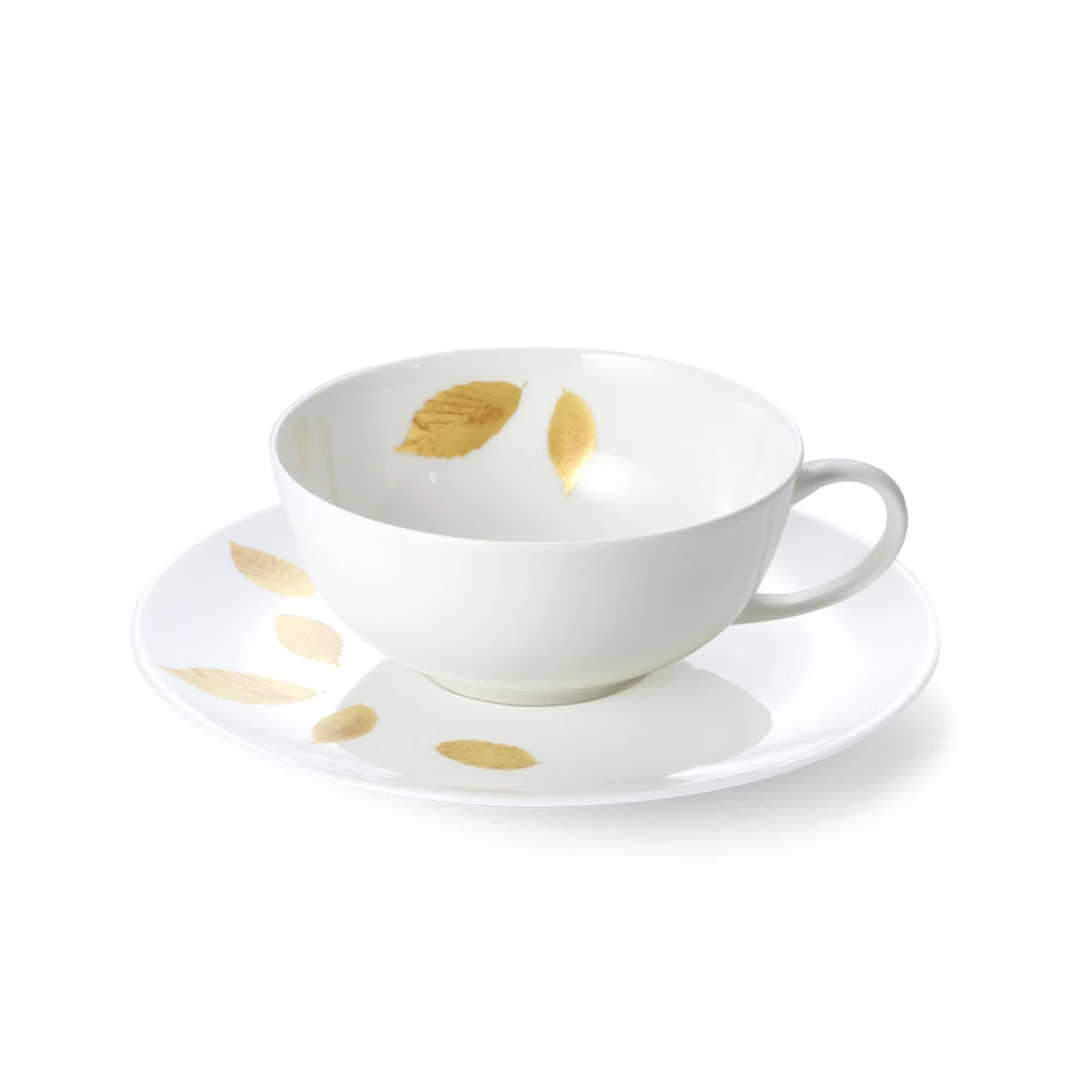 Adorned with golden leaves this dinnerware pattern from Dibbern is both playful and sophisticated. Made from fine bone china, making this collection quite durable. Dishwasher Safe and Not Microwave Safe due to the gold decor.