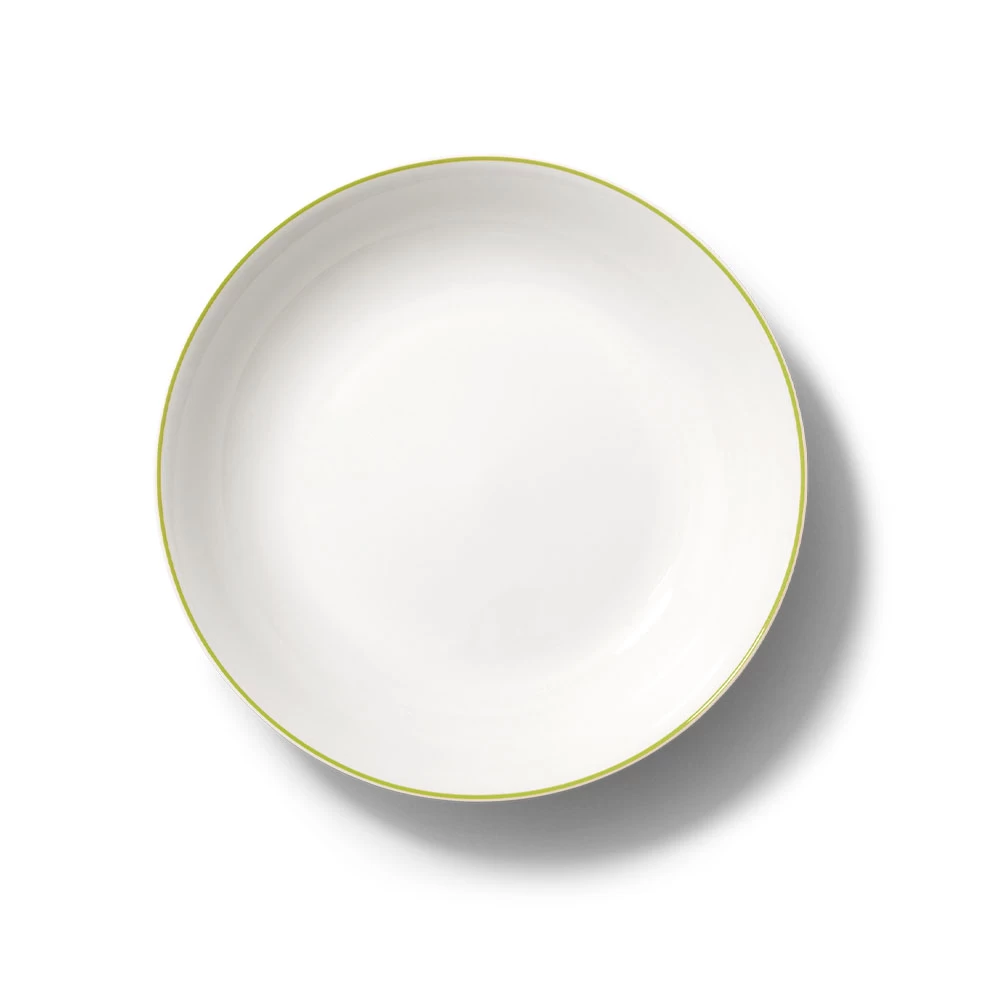 The Simplicity Lime Collection by Dibbern features a thin light green line around the rim of white glazed dinnerware. This collection exudes modern simplicity. Made from fine bone china, making this collection quite durable. Dishwasher and Microwave Safe.