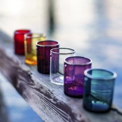 The Jai Shot Glasses feature hand-blown Murano glass embellished with a platinum rim and small hematite stone. The perfect size for drinking liquor and can even be kept in the freezer for a shot of vodka. Set of 4.