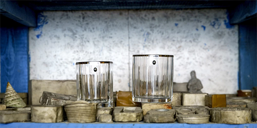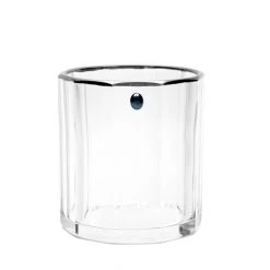 The Vera Glasses feature faceted glass with a platinum rim and small oval hematite stone. Made of hand-blown Murano glass. Originally designed as a whiskey glass but is equally suitable for water or wine. Set of 4.