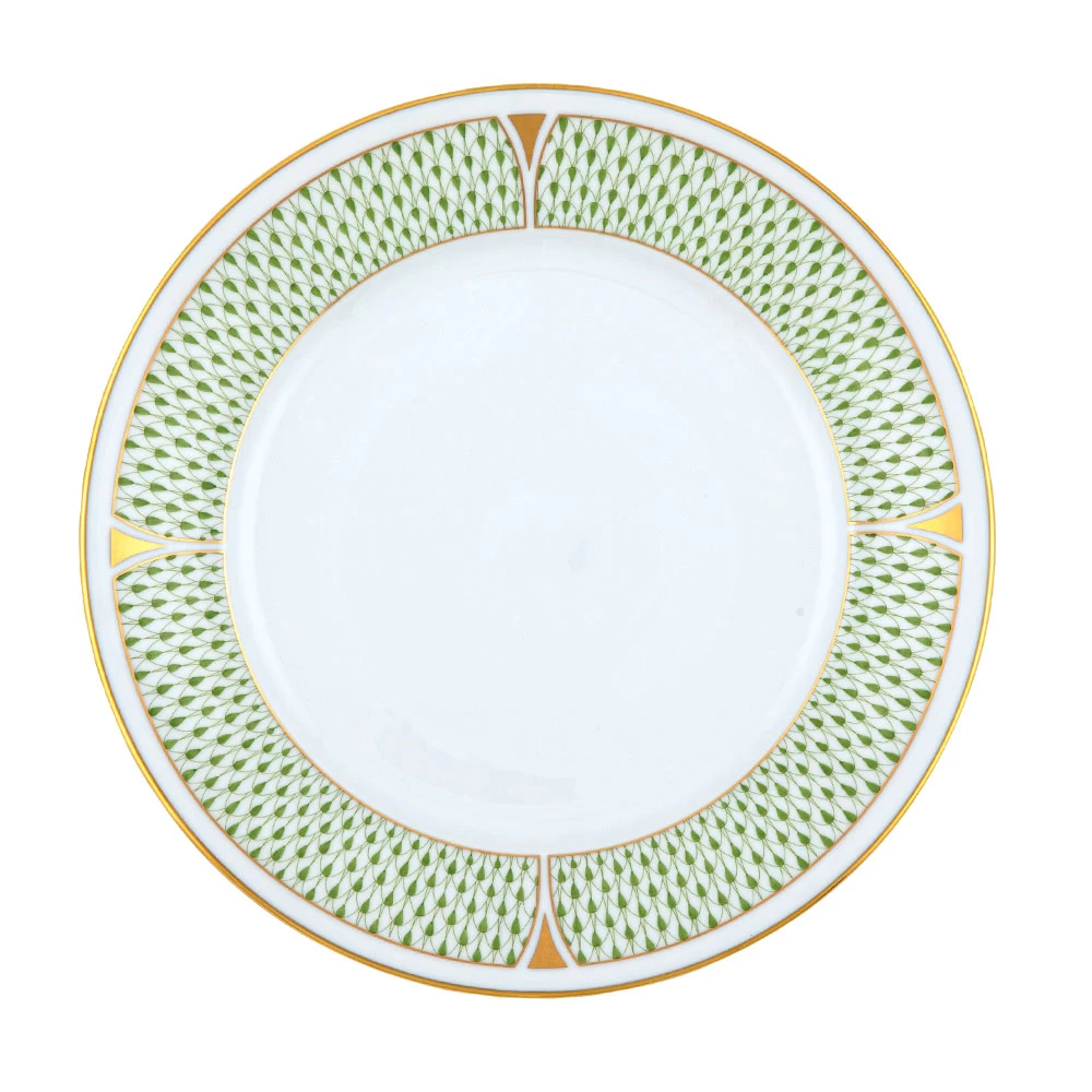 The Herend Art Deco Green dinnerware combines the fishnet motif with geometric inflection points in 24k gold, adding drama and elegance to each piece. As these two styles combine, Herend enters a new and captivatingly modern era with its dinnerware. Hand wash recommended and not microwave safe. Enjoy the dinner plate in green.