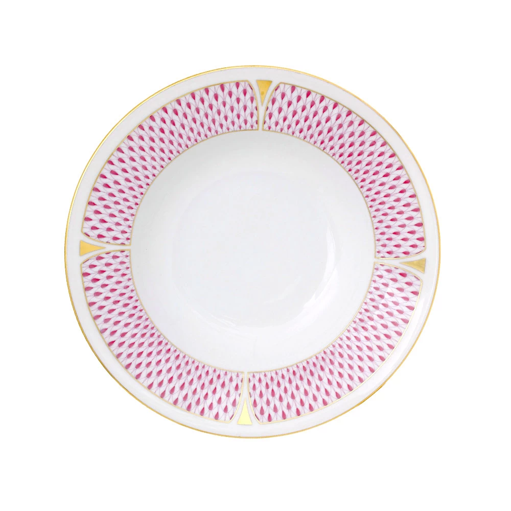 The Herend Art Deco Raspberry dinnerware combines the fishnet motif with geometric inflection points in 24k gold, adding drama and elegance to each piece. As these two styles combine, Herend enters a new and captivatingly modern era with its dinnerware. Hand wash recommended and not microwave safe. Enjoy the rimmed soup bowl in raspberry.