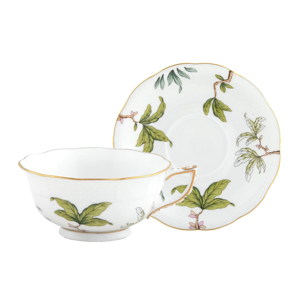 Decorated with greenery, Herend Foret Garland features hand-painted stylized leaves and budding tree branches. The porcelain has a slight textural design on the border, leading up to the undulating gold rim. Hand wash recommended and not microwave safe.
