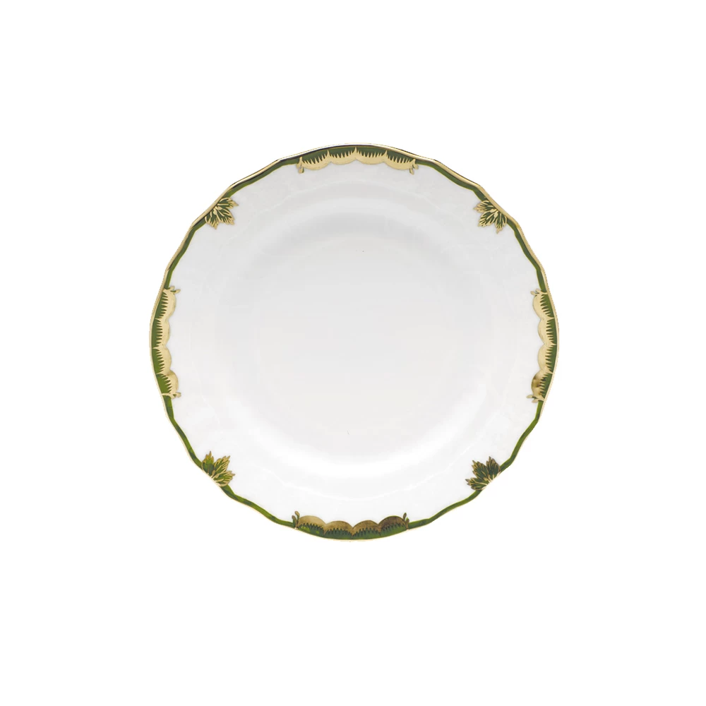 Adorned with gold and dark green, the Herend Princess Victoria Dinnerware features a hand-painted design around the border and finished with a gold rim. This design is a variation on the iconic Queen Victoria pattern, keeping its decorative border. The porcelain has a slight textural design leading up to the undulating rim. Hand wash recommended and not microwave safe.