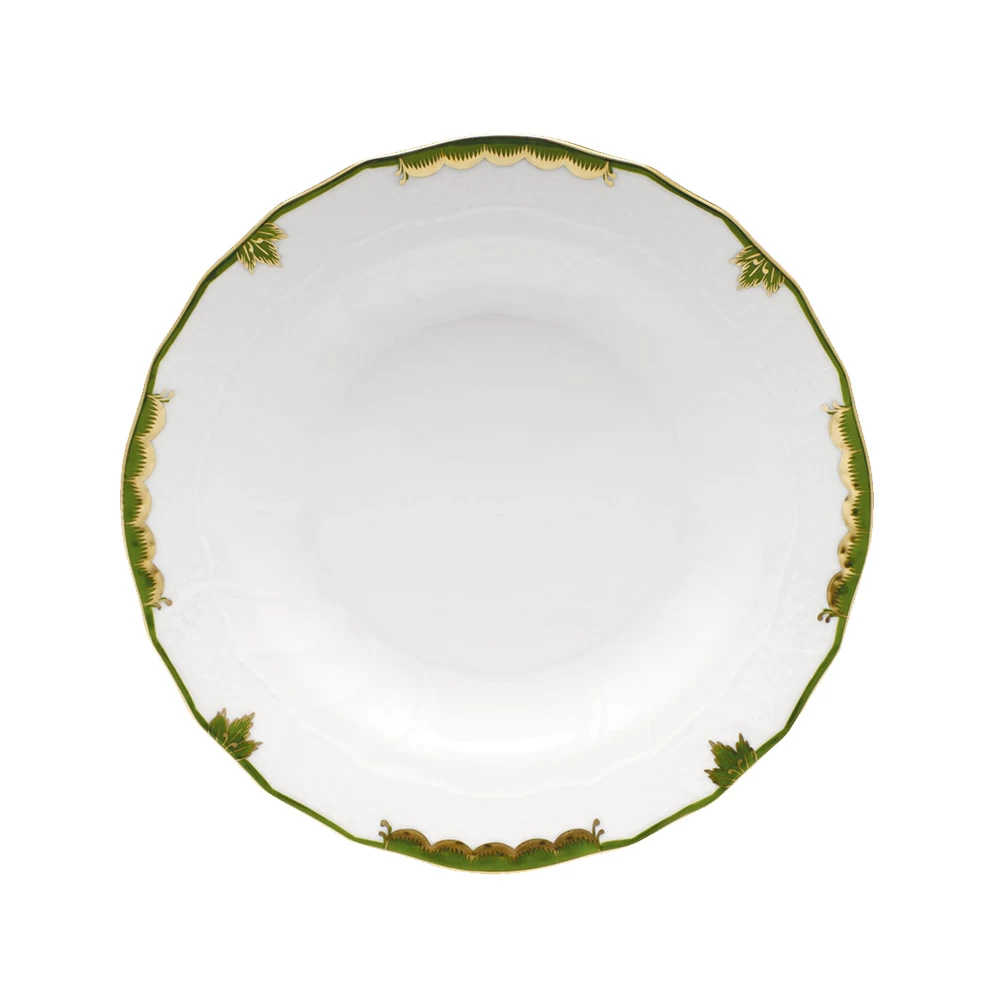 Adorned with gold and dark green, the Herend Princess Victoria Dinnerware features a hand-painted design around the border and finished with a gold rim. This design is a variation on the iconic Queen Victoria pattern, keeping its decorative border. The porcelain has a slight textural design leading up to the undulating rim. Hand wash recommended and not microwave safe.