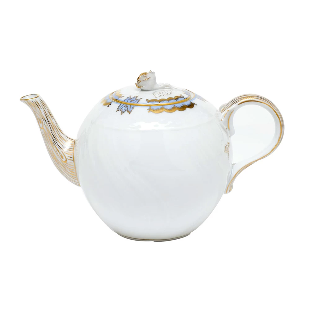 Adorned with gold and light blue, the Herend Princess Victoria Dinnerware features a hand-painted design around the border and finished with a gold rim. This design is a variation on the iconic Queen Victoria pattern, keeping its decorative border. The porcelain has a slight textural design leading up to the undulating rim. Hand wash recommended and not microwave safe.