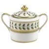 The Rothschild Birds Dinnerware is one of Herend’s most iconic and historic patterns. Originally created in 1860 for the Rothschild family of Europe to thank them for their patronage. The collection portrays a tale about the Baroness who lost her pearl necklace in her garden. It was only discovered after the gardener saw birds playing with it in a tree. Thus, the dinnerware features a pearl necklace in a tree surrounded by two birds and butterflies. The porcelain has a slight textural design leading up to the undulating gold rim. Hand wash recommended and not microwave safe.