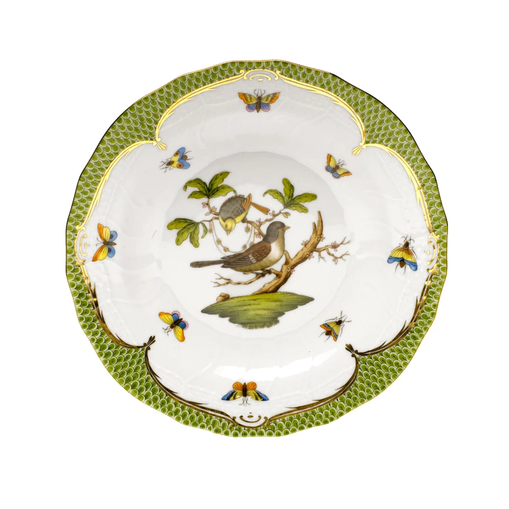 A twist on the iconic design, featuring the Fish Scale design around the Rothschild birds. The Rothschild Bird Green Dinnerware is all hand-painted. The porcelain has a slight textural design leading up to the undulating gold rim. Hand wash recommended and not microwave safe.