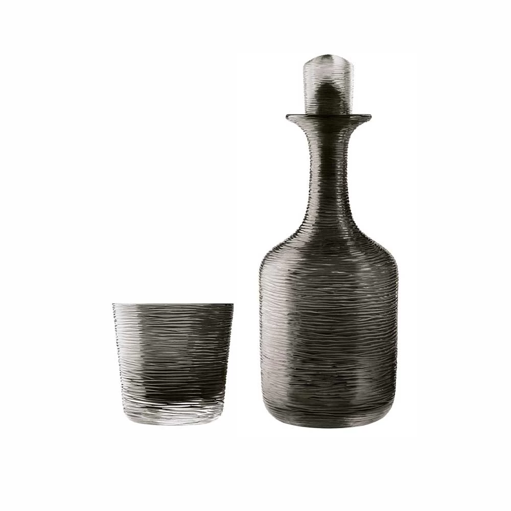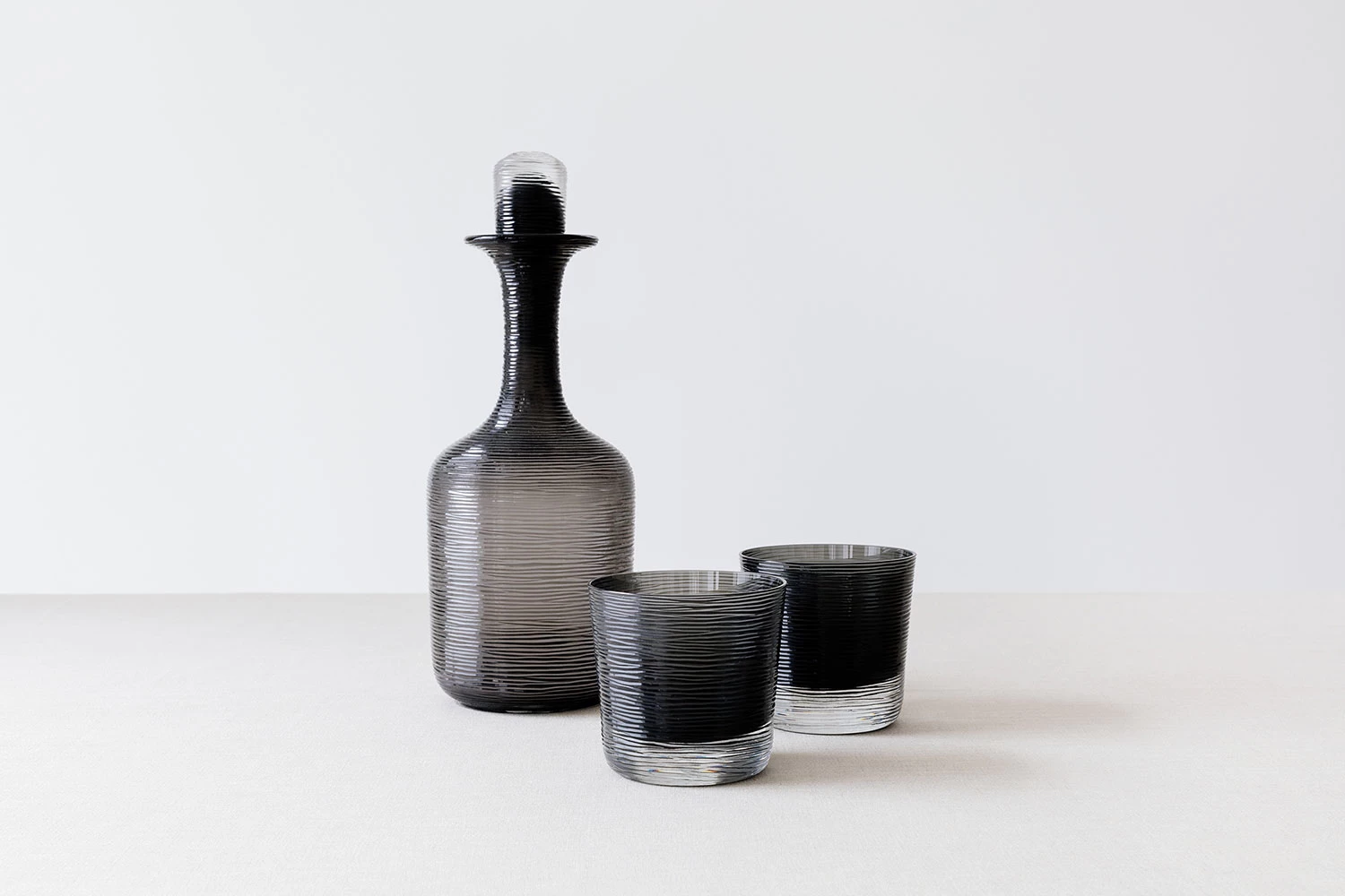 Hering Berlin’s Groove Barware Collection features glasses and decanters. Each glass is covered with a wavy design that both enhances the hand and mouth feel and also allows diffuse light to pass through. Add these glasses to your collection to allow for a unique sensory experience of sight, touch, and taste.