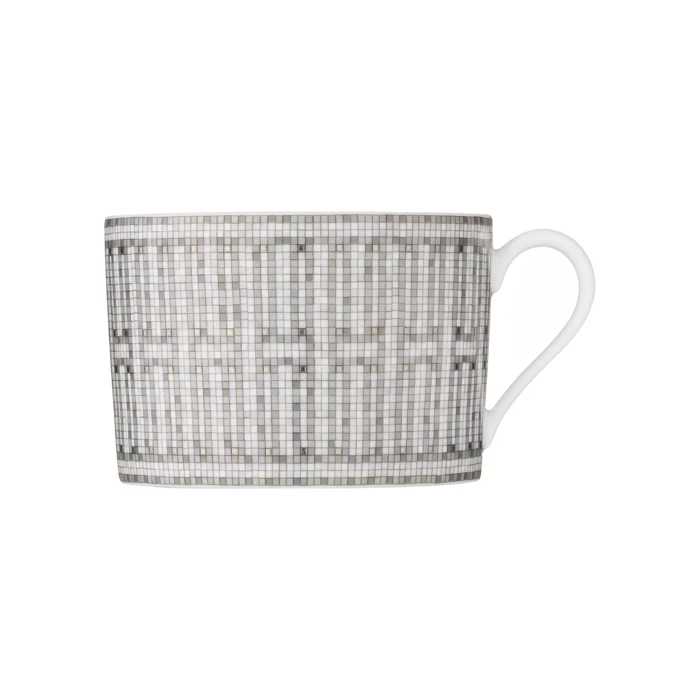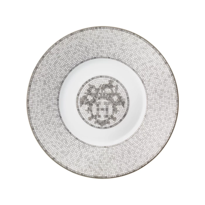 In 1880, Charles-Émile Hermès took over the harness workshop that belonged to his father Thierry Hermès, and relocated it to 24 Rue du Faubourg Saint-Honoré in Paris, where it continues to serve as the flagship store of the iconic family business today. The striking pattern of interlocking platinum and grey geometric Greek friezes that rims each piece of Mosaïque au 24 Limoges porcelain dinnerware pays tribute to the historic Hermès shop by emulating its similarly patterned sandstone mosaic floor, which was designed by Henry Pannier for the store in 1926.