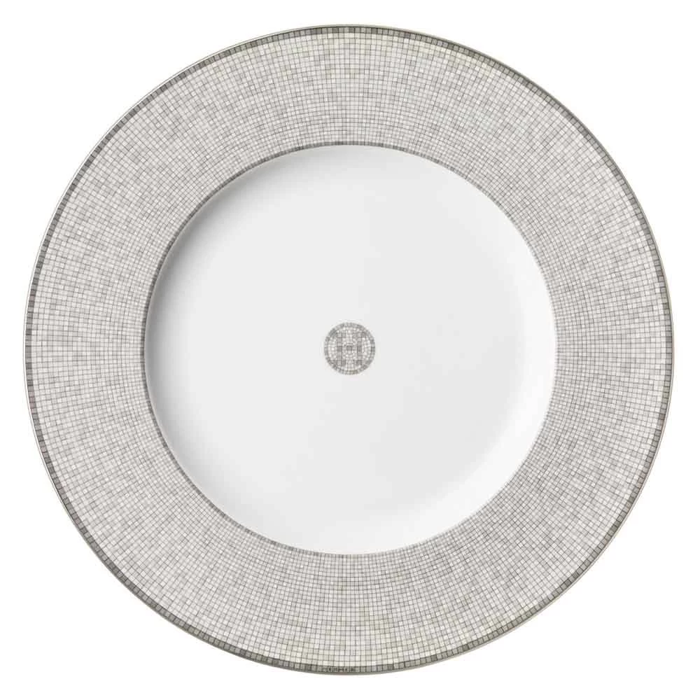 In 1880, Charles-Émile Hermès took over the harness workshop that belonged to his father Thierry Hermès, and relocated it to 24 Rue du Faubourg Saint-Honoré in Paris, where it continues to serve as the flagship store of the iconic family business today. The striking pattern of interlocking platinum and grey geometric Greek friezes that rims each piece of Mosaïque au 24 Limoges porcelain dinnerware pays tribute to the historic Hermès shop by emulating its similarly patterned sandstone mosaic floor, which was designed by Henry Pannier for the store in 1926.