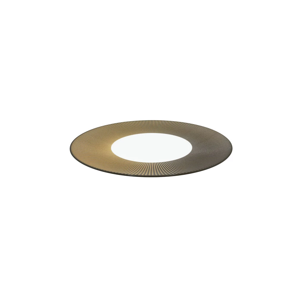 The Boléro Brown Irisé Dinnerware collection by J.L Coquet creates the illusion of changing from gold to taupe-brown. Depending on the angle in which it’s viewed, the textural ridges along the rim pick up a satin metallic taupe-to-gold hue. Made from Limoges Porcelain.