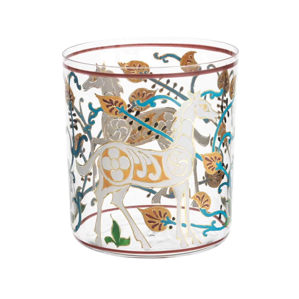 Lobmeyr Alhambra Double Old Fashioned Tumblers offer a detailed, hand-painted design on hand-blown muslin glass. They are inspired by abstract animal drawings of the famous “Jarra” vase at the Alhambra palace in Granada. The enamel painted friezes with animals seem to be of timeless beauty and have now been realized in a series of 6 tumblers.