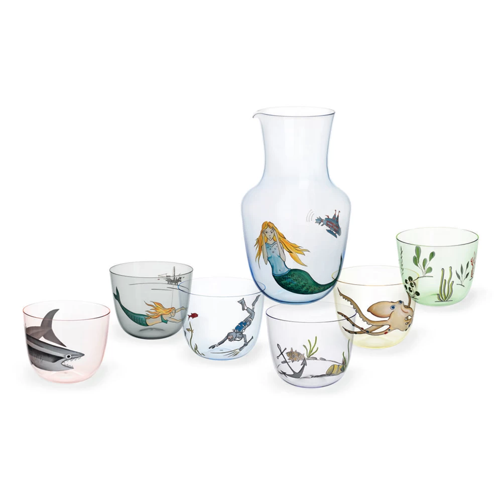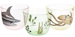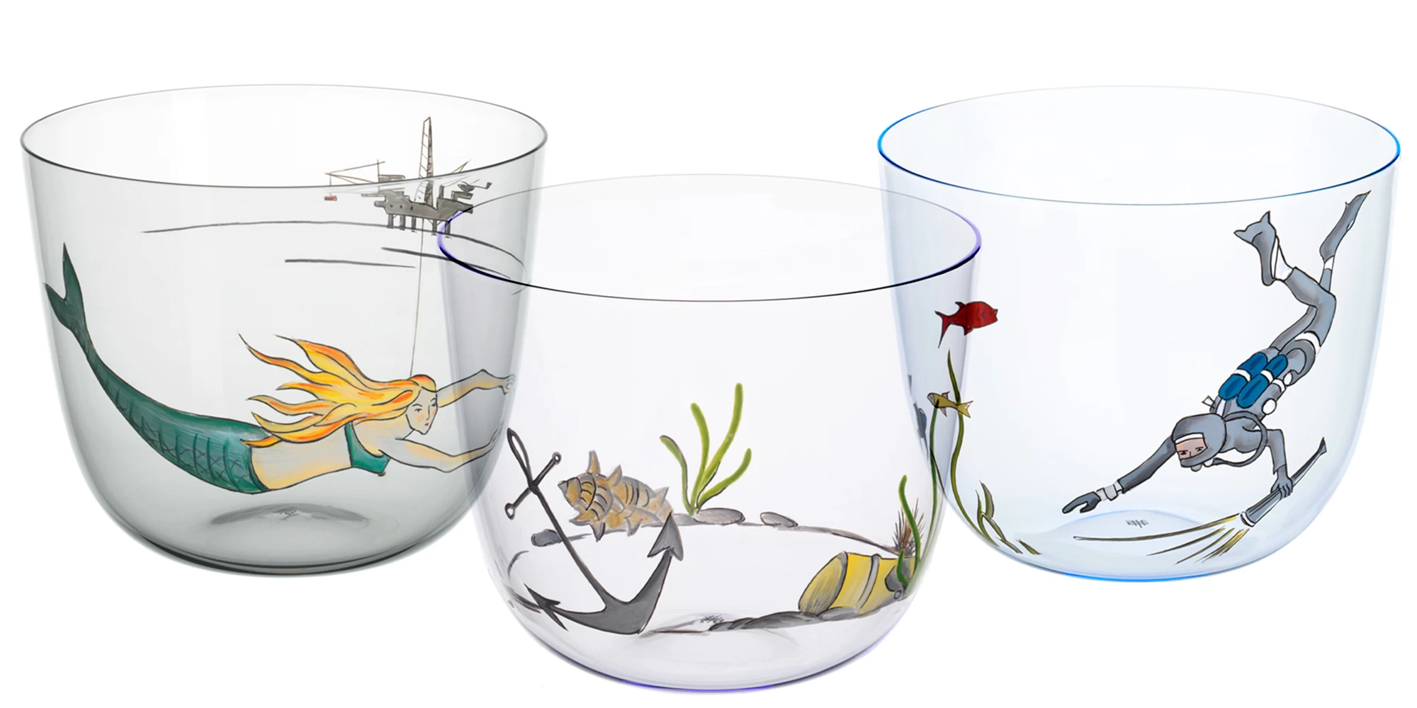 High Seas opens our eyes to the beauty and sensitivity to the finite expanses of the Oceans. Featuring hand painted ocean life along with references to human impact on these creatures. Hand painted on the Alpha series which is made from Lobmeyrโs renowned muslin glass; ultra-thin and hand blown, it is both sublimely delicate and remarkable resilient. Hand wash only.