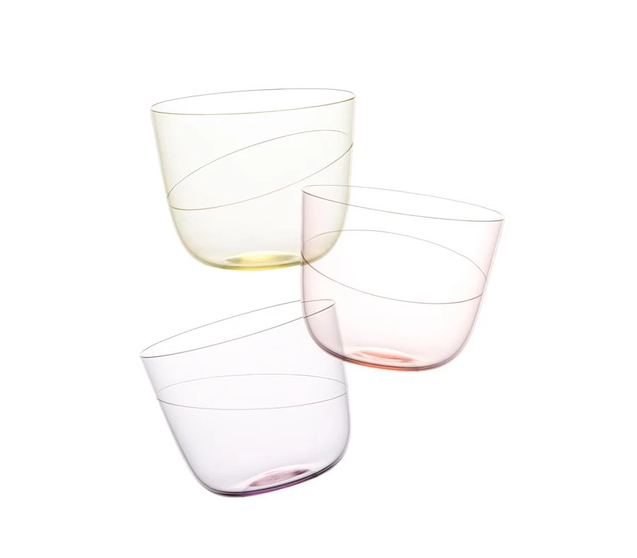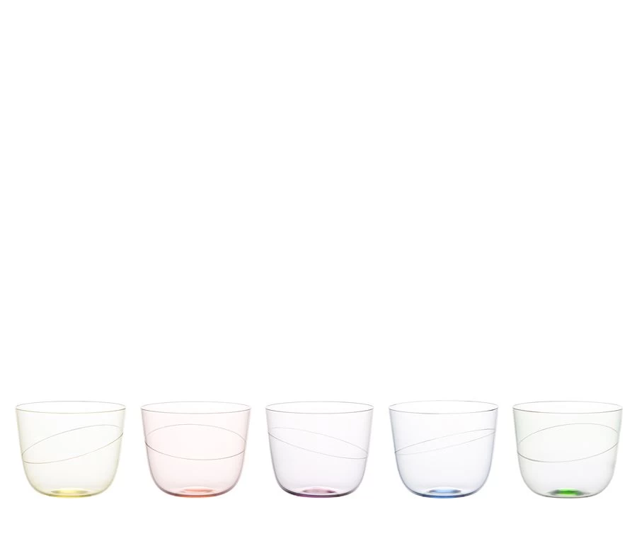 An iconic Lobmeyr design from 1952, the Alpha setting is based on copper beakers from the Middle Ages, updated for postwar families seeking elegance and practicality. Appropriately, Alpha is made from Lobmeyr’s renowned muslin glass; ultra-thin and hand blown, it is both sublimely delicate and remarkable resilient. The Ellipse collection features the classic Alpha forms enlivened by colorful tints, as well as a tilting line engraved around the center that fools the eye and gives this stylish setting a twist of humor. Muslin crystal. Hand wash only.