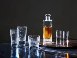 A triumph of visual fascination, the vessels in the Triennale Collection have faceted outsides that encircle round insides, as well as bottoms so thick that the liquid inside seems to hover. The collection’s heavy construction is both complemented and lightened by the depth and clarity of the crystal.