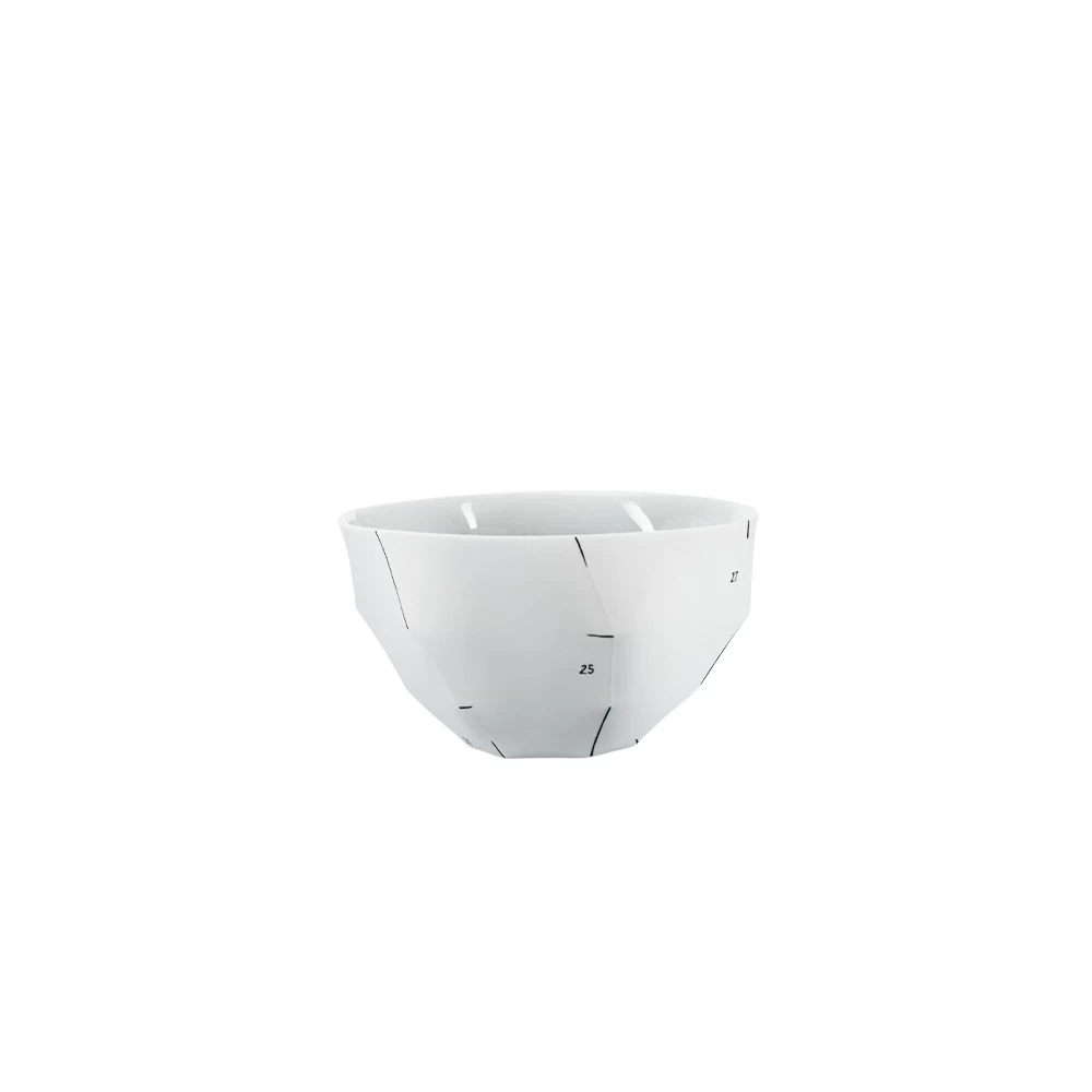 Inspired by the Far East, Argentinian designer, Ruth Gurvich created her Lightscape designs in collaboration with . Each piece was first molded in paper and then handcrafted in porcelain. White bisque porcelain with white glazed interior and artfully painted pencil marks.