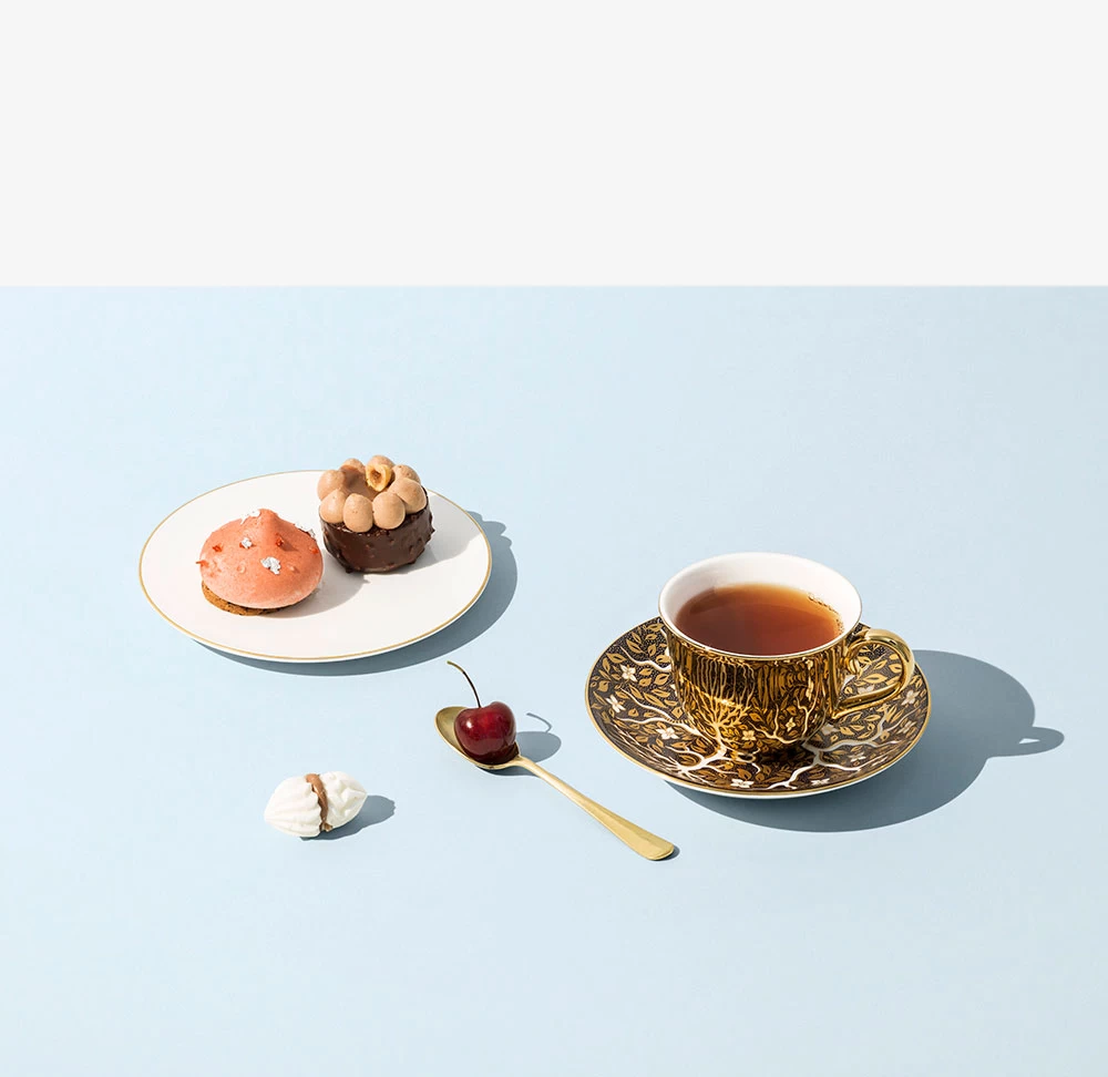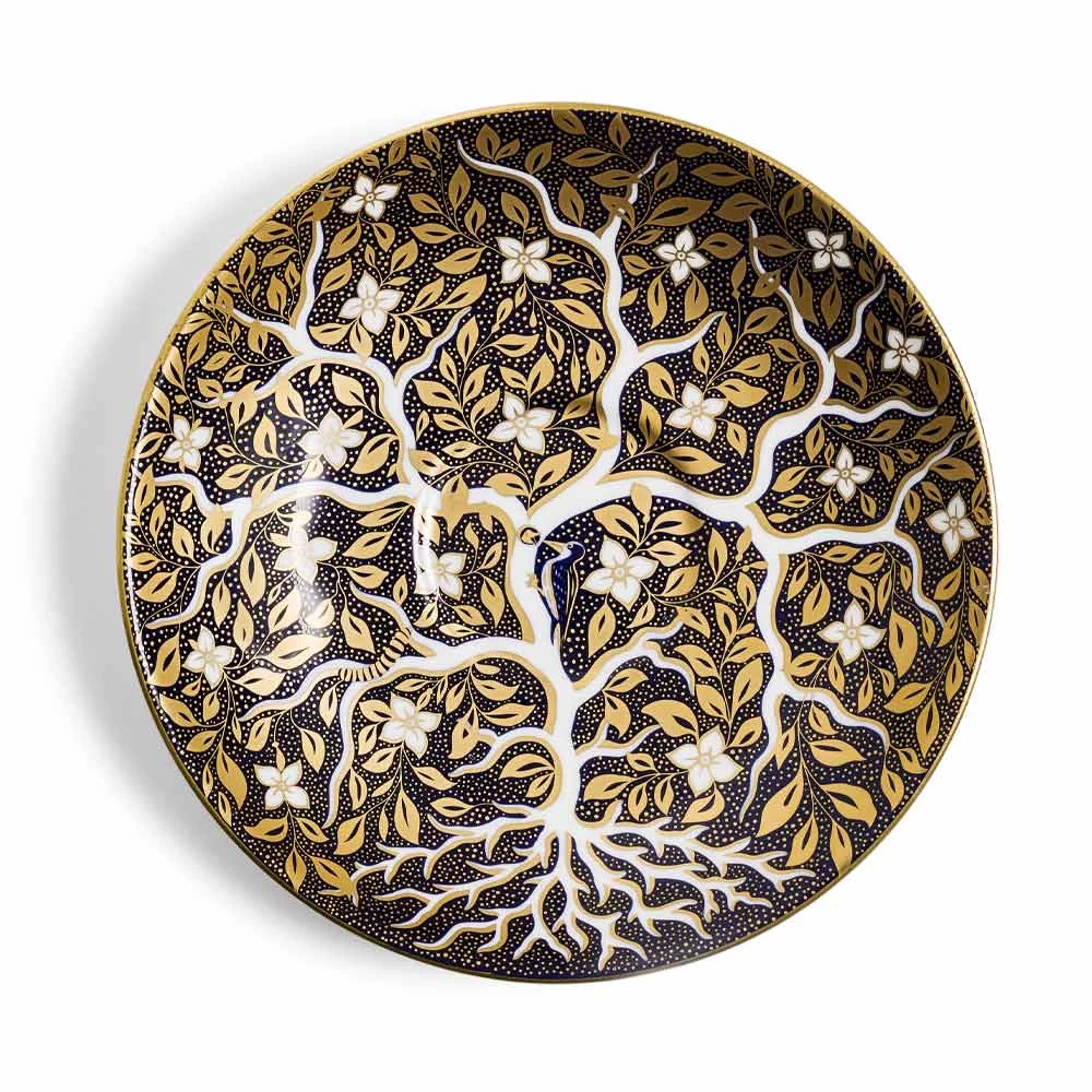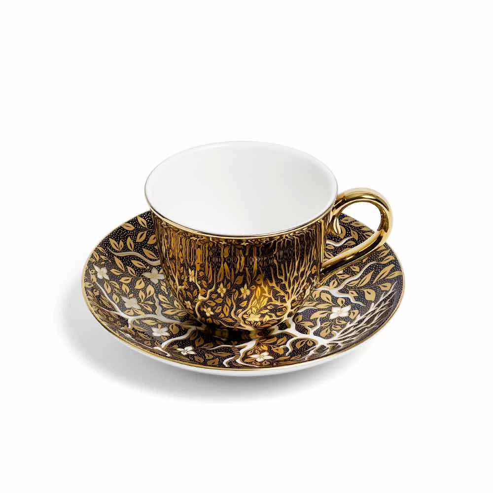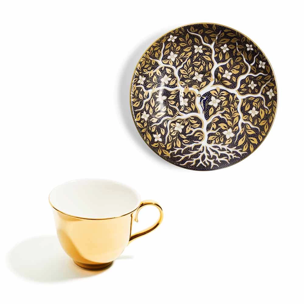 About the saucer: The enchanting Tree of Life design draws inspiration from Ridgway and Spode patterns of the early 19th Century. Crafted with exquisite precision, this design showcases a stunning tree, crafted from bright white porcelain branches and adorned with delicate 22k gold leaves. Discover captivating touches like a nurturing mother woodpecker and a surreal giant caterpillar, transforming tradition into mesmerizing artistry.