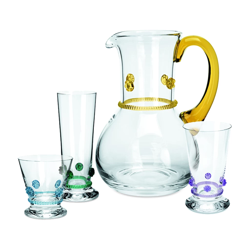 The Theresienthal Bacchus Collection was designed by Henriette Steigerwald in 1890. The collection features colored glass accents which are applied at the hands of the master glassmaker while the glass is still hot. The Bacchus collection pairs a classic silhouette with a touch of whimsy.