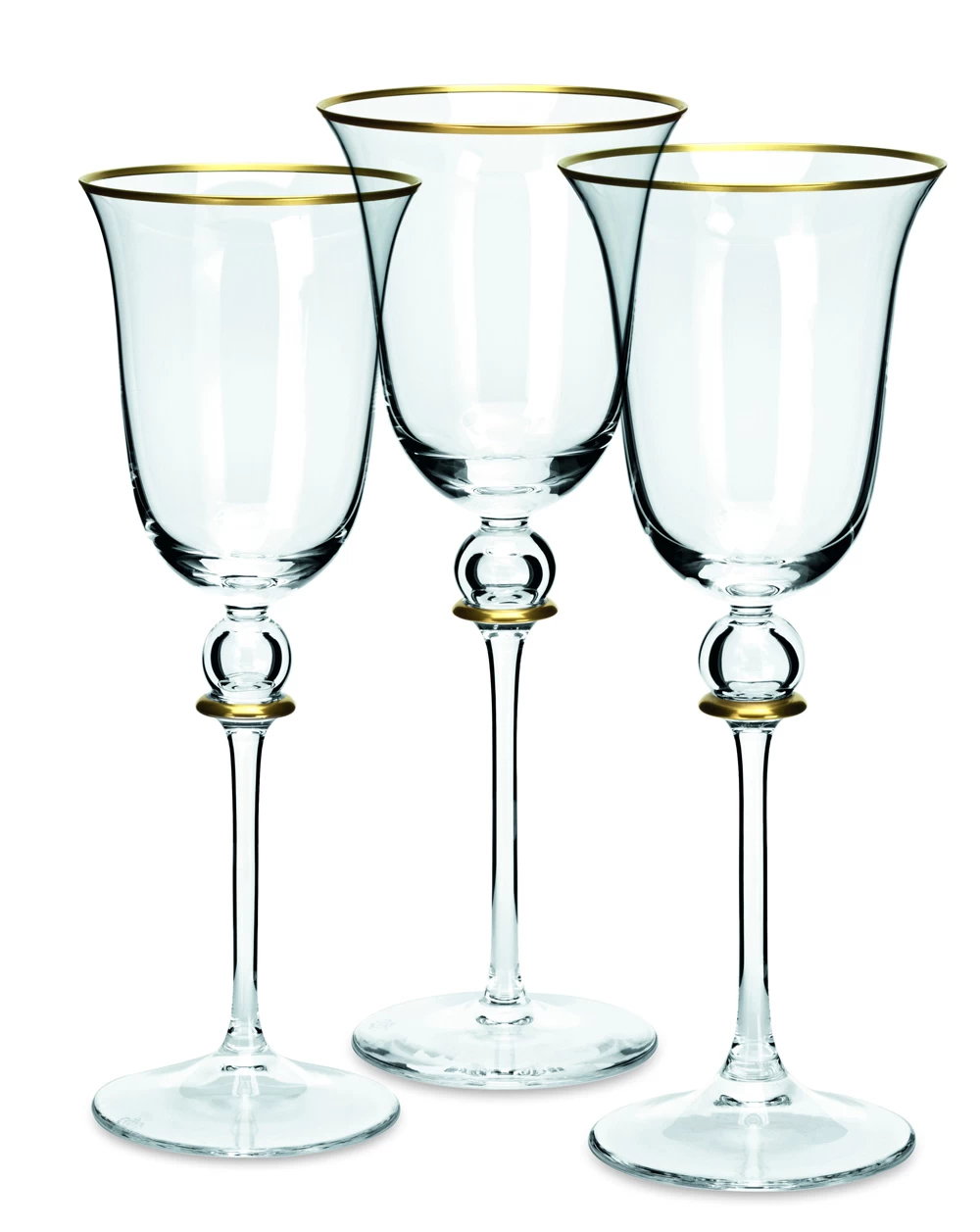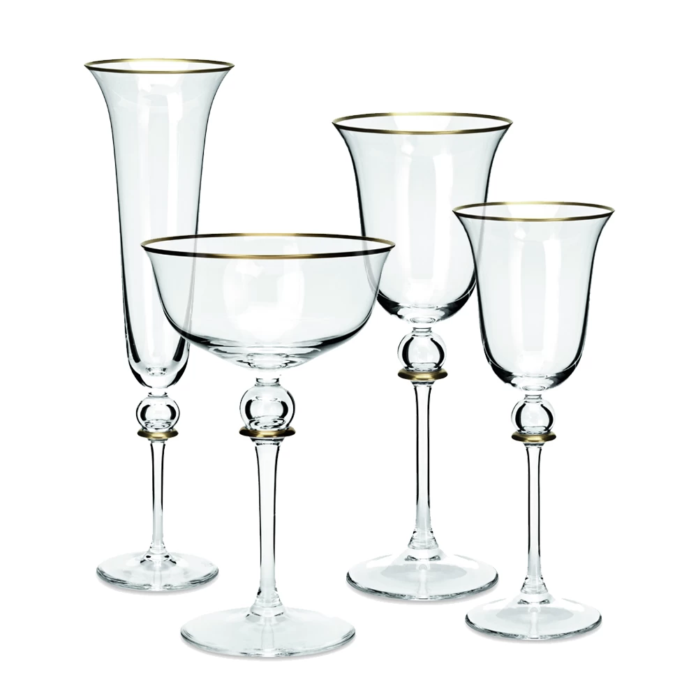 A fine, 24k gold rim enhances the perimeter of the Juwel handcut glassware while a hollow sphere underscored by yet another gold rim perches at the top of the stem. Can be engraved with your monogram.