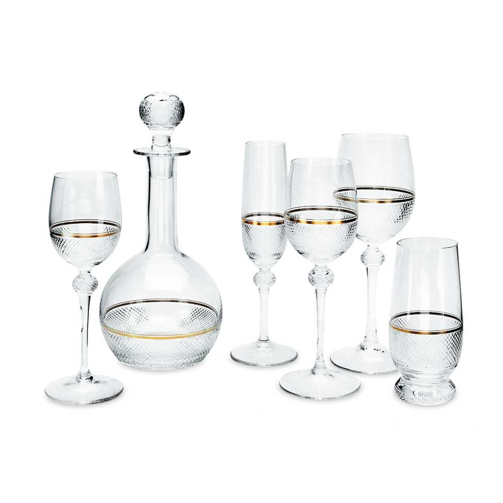 Prestige’s raised diamond cut on the lower half of the glass is more than decorative—its tactile surface provides a nice grip. A double band of 24k gold—one thin and the other thick—encircles the handcut glass. Can be monogrammed with your initials or engraved with a coat of arms.